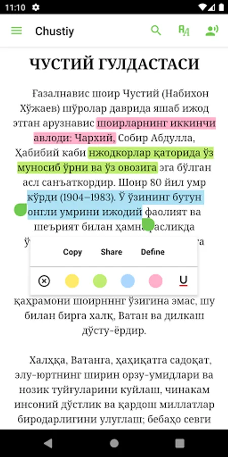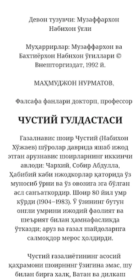 Xalqqa, Vatanga, haqiqatga sadoqat, elu-yurtning shirin orzu-umidlari va nozik tuyg'ularini kuylash, chinakam insoniy do'stlik va qardosh millatlar birodarligini uluglash; bebaho sevgi va fidoyi sadoqatni ardoqlash; mardlik, olijanoblik va ezgulikni qadrlash; tubanlik, yovuzlik va munofiqlikni qoralash - ana shu-lar Chustiy g'azaliyotining asosiy g'oyaviy-estetik yo'nalishlaridir. Darhaqiqat, Mavlono Chustiyning hassos qalbida uch oftob hamisha porlab turadi; san'atkor shoir o'zining "To'yona" sarlavhali g'azalida bu xususda shunday yozadi: