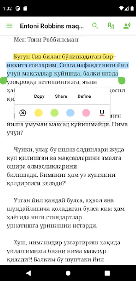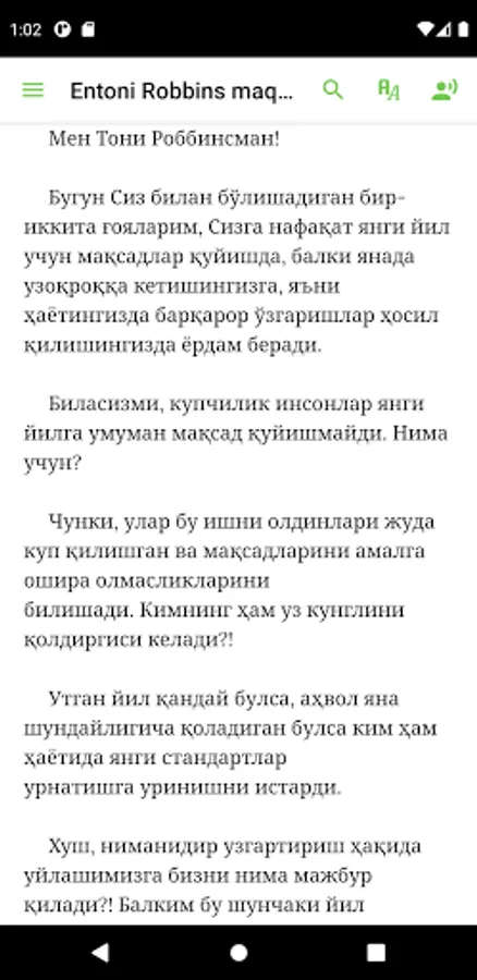 Har qanday insoning o'z maqsadi bo'ladi lekin har kim ham maqsadiga yeta olmaydi .Maqsadga yetish yo'larini bilgan inson orzularini amalga oshiradi.Entoniy Robinsoning maqsadga yetish kitobi endi ozbek tilga oshi. va vaqtni to'gri sarflashni boshlaydi. Maqsadga yetishda asosiy rol oynovchu ham vaqt bu kitobni o'kib chiqan inson yangicha dunyo karashiga ega boladi va dunyo haqidagi tushunchangizni ijobiy tomonga yangilang.
