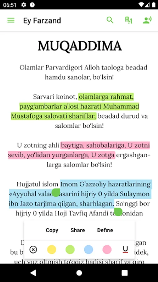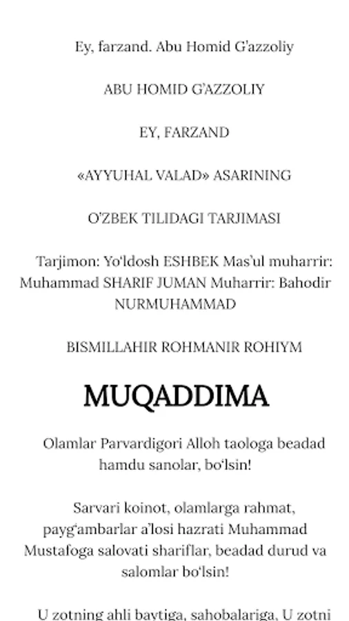 salomlar bo'lsin! Hujjatul islom Imom G'azzoliy hazratlarining "Ayyuhal valad" asarini hijriy 960 yilda Sulaymon ibn Jazo tarjima qilgan, sharhlagan. So'nggi bor hijriy 1302 yilda Hoji Tavfiq Afandi tomonidan nashr etilgan. Davr ehtiyojiga ko'ra fiqh sifatida yozilgan bu buyuk asar muallifning o'zi ta'kidlaganidek, uch yuz oltmish to'qqiz hadisi sharif va qirq to'rt avliyo xabari bilan boyitilgan. Hadisi shariflar quyida nomlari aytilgan hadis kitoblaridan, mo 'tabar asarlardan sinchkovlik bilan tanlab olingan. Manba bo'lgan hadis va xabar kitoblari: