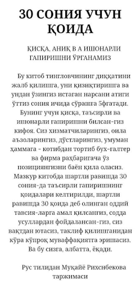 O'ttiz soniya sizning kalitingiz. Bu sizning pozitsiyangizni shakllantirish uchun qancha vaqt kerak bo'ladi. Ushbu kitob sizga haydovchi o'rindig'iga kirishga yordam beradigan har qanday vaziyatda 30 soniyali xabarni yozishni va undan foydalanishni o'rgatadi. Sarlavha: Suhbatdoshni 30 soniyada qanday ishontirish mumkin.