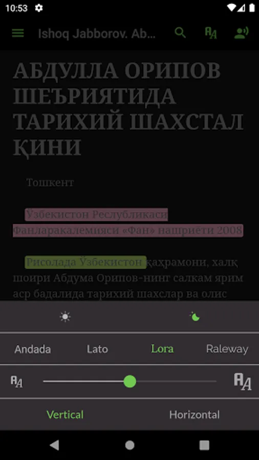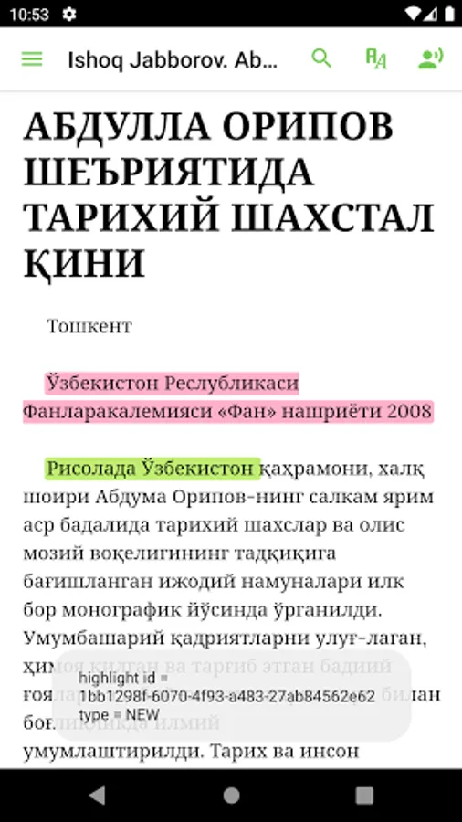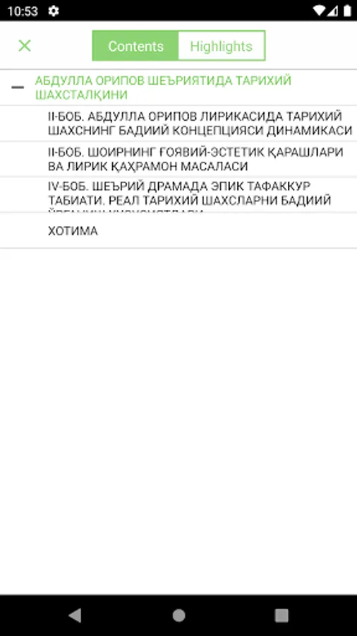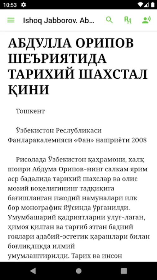 Abdulla Oripov she'riyatida tarixiy shaxs badiiy konsepsiyasining dinamikasini kuzatish Dissergasiyada Abdulla Oripov ijodida tarixiy shaxs konsspsi-yasi va lirik qahramon masalasiiipg quyidagi qirralari yoritildi: shoir asarlarida tarixiy shaxs konselsiyasining yangi-yangi jihatlari biri ikkinchisiii takrorlamagan holda zohir bo'lishi ochib borildi; - qahramonlarniig ma'laviy-intellektual olami o'rganildi, ularln badiiy-falsafiy idrok va ifoda qilishdagi shoir izlanishlari yoritiddi abdulla oripov, ishok jaborov, sheriyata tarixiy shaxs talkini
