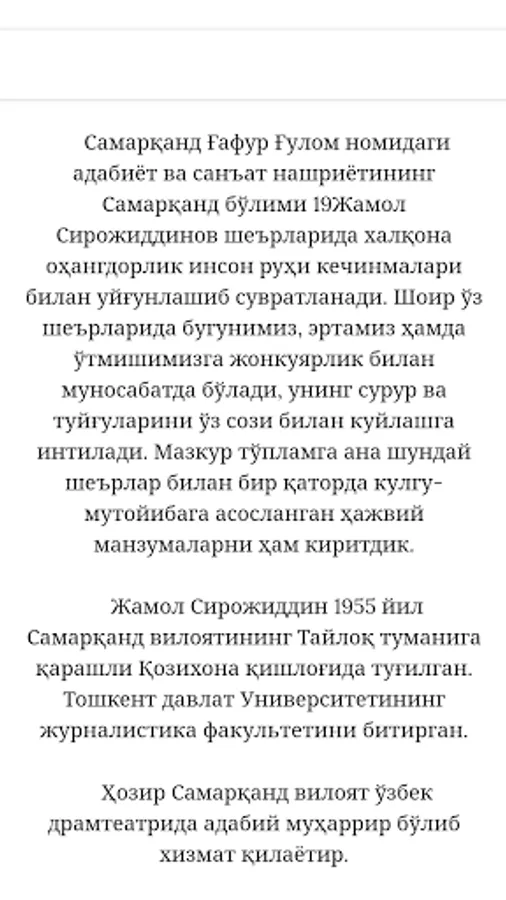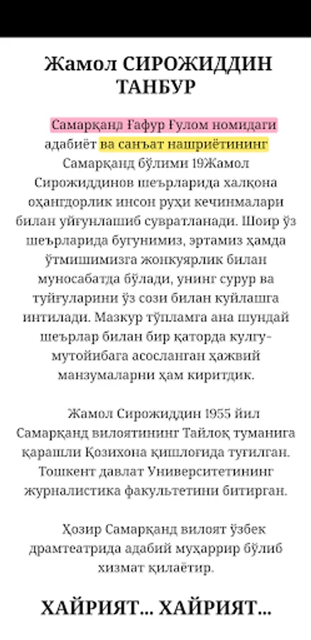 Jamol Sirojiddin. Tanbur. Shoirning ilk kitobi. Jamol sirjiddin tanbur. Samarqand G'afur G'ulom nomidagi adabiyot va san'at nashriyotining. Samarqand bo'limi 1990. Jamol Sirojiddinov she'rlarida xalqona ohangdorlik inson ruhi kechinmalari bilan uyg'unlashib suvratlanadi. Shoir o'z she'rlarida bugunimiz, ertamiz hamda o'tmishimizga jonkuyarlik bilan munosabatda bo'ladi, uning surur va tuyg'ularini o'z sozi bilan kuylashga intiladi.