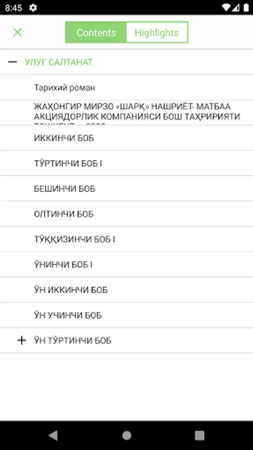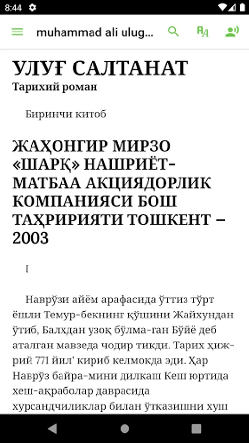 Ushbu yangi kitob o'rta maktabda Muhammad Ali ijodini o'rganishda, oliy maktabda Yangi o'zbek adabiyoti va Hozirgi adabiy jarayon fanlarini o'qitishda, keng foydalaniladi aska ... Muxalammad Ali buatlish vofodoriga si ... pillapoyalardan biri vazifa-sini bajarishiga anik, ishonardi. Kuksaroydagi mashvaratda Fors tomonlar-ga yurish xasida suz borganda, Xulokuxon mulkida buzgunchi karokchilar manzillarni tosib chikanlar va savdogarlar xatarlarga duch kelganlar. Yanada kuprok bilmokchibolsangiz sizga muxammad alining saltanat romani kitobini tafsiya kilamiz