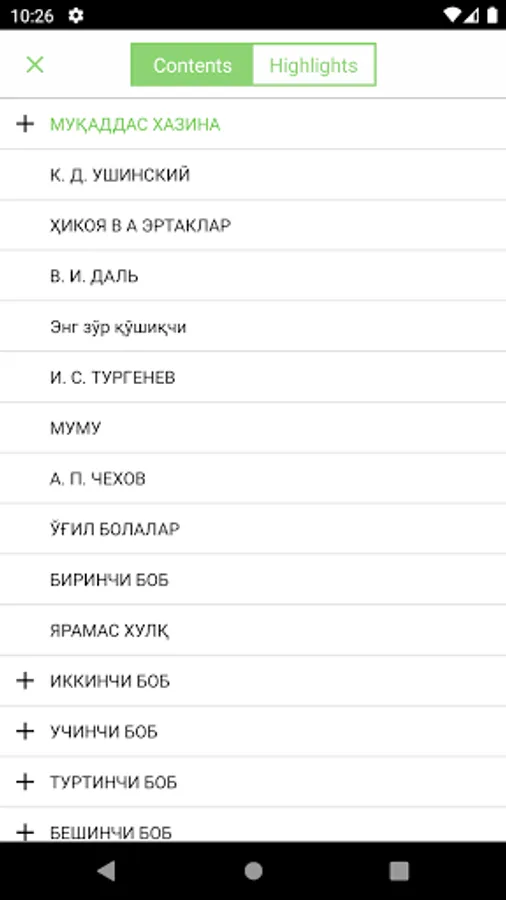 Vladimir Odoyevskiy "Ayoz bobo" "To'rt karning mashmashasi haqida hind rivoyati" Konstantin Ushinskiy "Hikoya va ertaklar", Vladimir Dal, Ivan Turgenevning, Anton Chexovning "O'g'il bolalar", "Akrasqa", Lev Tolstoy " Milton va Bulka "," Toshbaqa "," Bulka va bo'ri ", Vladimir Korolenkoning" Ko'r muzikachi "Kabi asarlar endi bizning programmada to'liq talqinda. Siz Muqaddas xazina kitobida