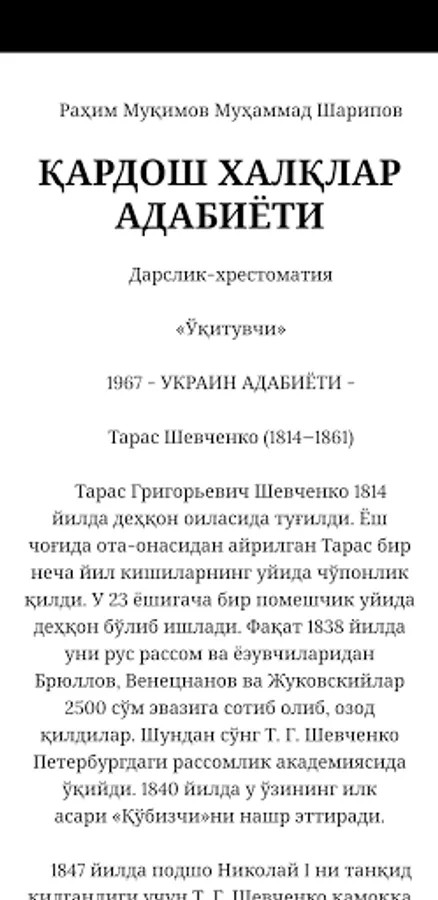 assalomu alekum bugun sizlarga tafsiya qilmoqchi bo'lgan kitobimiz jahon adabiyoti xar bir zamoning uz yozuvchilari bolgan adabiyot esa bu barcha yozuvchilar, kalamshunoslar, sanat soxasida ijod kilivchu insonlarning mexnat maxsuludir uzbekiston kitoblar yozgan kalamshunoslar alisher navoiy, zahiridin muhammadbobur, muhammadyusuf kabi insonlar bo'lganlar rossiyada bulsa aleksandor seregeyevich pushkin lev nikolayevich talstoy va boshkalar har davlatning o'zining yozuvchilari bo'lgan bular haqida kardoshlar halqlari ababiyoti kitobidan o'qib bilishingiz mumkun.