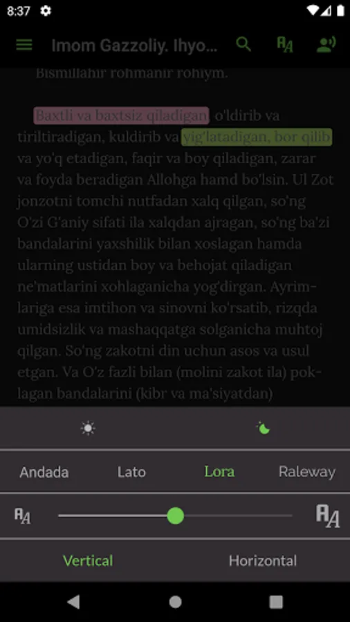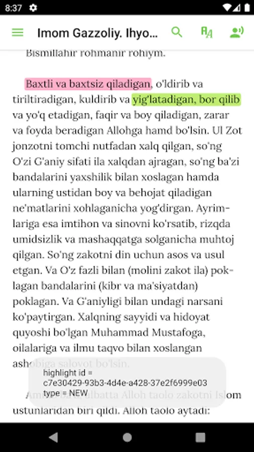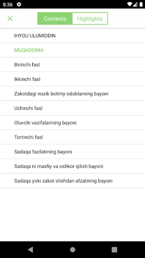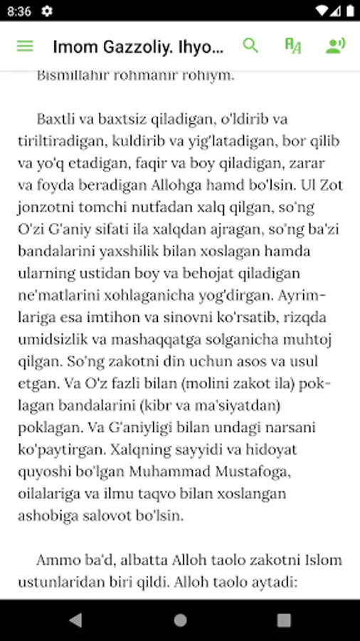 IHYOU ULUMIDDIN (Din ilmlarini jonlantirish) Zakot sirlari kitobi. Tarjimon: Mubashshir Ahmad Toshkent "Movarounnahr". MUNDARIJA. Muqaddima Birinchi fasl. Zakotning turlari va vojib bo'lish sabablari haqida Ikkinchi fasl. (Zakotni) ado qilish va uning botiniy hamda zohiriy shartlari Zakotdagi nozik botiniy odoblarning bayoni Uchinchi fasl.Demakki, bu dahshatlar “Sahihayn” da kelgan yekan, zakotning sirlarini valeyda beruini, oshkor mahiri maxfiyohini miqdorda qisqacha ochib berish dinning muhim ishlaridan bo'lib qoldi. Bu yesa to'rt faslda ayon bo'ladi: Birinchi fasl zakotning turlari va vojib bo'lish sabablari haqida.