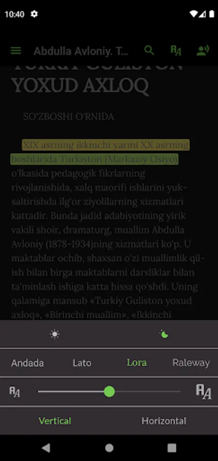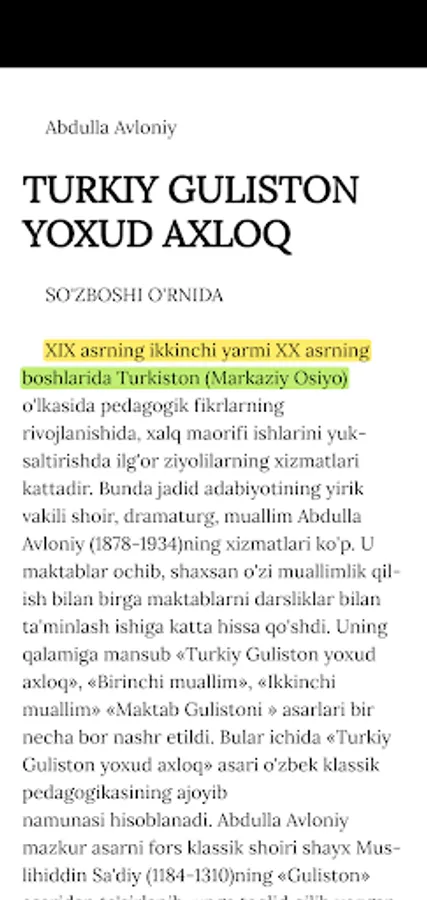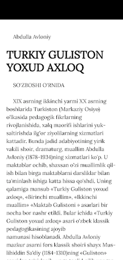 Abdulla Avloniyning eng mashxur asarlaridan birini sizlarga taqdim qilmoqdamiz, Turkiy Guliston Yoxud Axloq asarida Buyuk turkiylarning odob axloqi, ularning kelib chiqish tarixi va tarbiya madaniyati, urf odilibit''so'orz Bu asarni o'qib siz Buyuk turkiylarning qanday xalq bo'lganini ularning tarixini bilib olasiz, Ushbu asar yangi O'zbek adabiyoti uyg'onish davrining eng mashxur asarlaridandir.