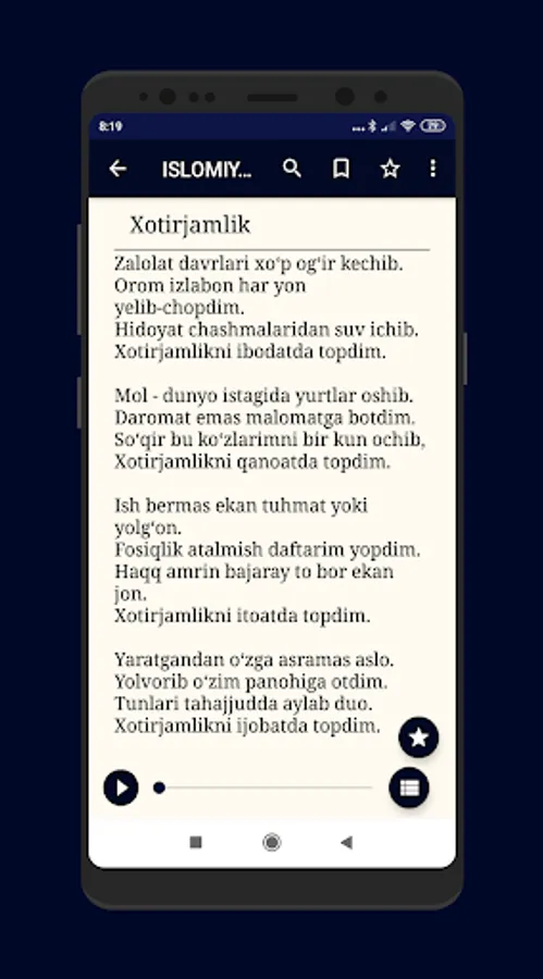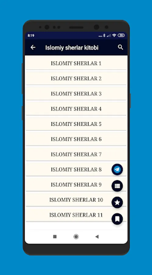 Assallomu alleykum do`slar yurtimizda shoirlarimizni sherlari juda ko`p ammo islomiysi unchalik ko`p emas sizlarga islomiy sherlardan to`plangan kitobni o`qib ko`rishingizni istardim albatta yuklab olasdam