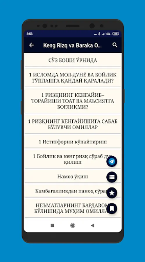 Har bir inson umri davomida yahshi yeb - ichishni va farozon hayot kechirishni istaydi ammo u faqat rizq - nasibadan ortig`iga muyasar bo`lmaydi. Shu manoda aytish mumkunki diniy marifiy mavzuda bitilgan ushbu risola rizq tushunchasi risqni hosil qiladigan kasib hunar va shu risqlarni ko`payib - kamayishiga sabab bo`ladigan omillar hususida atrofilcha mushrada qishirdi qlish Qo`lingizdagi manashu mavzuga qiziqqan keng rizq va baraka omillari haqidagi kitobimizni barcha o`quvchilarni befarq qoldirmaydi degan umidamiz.