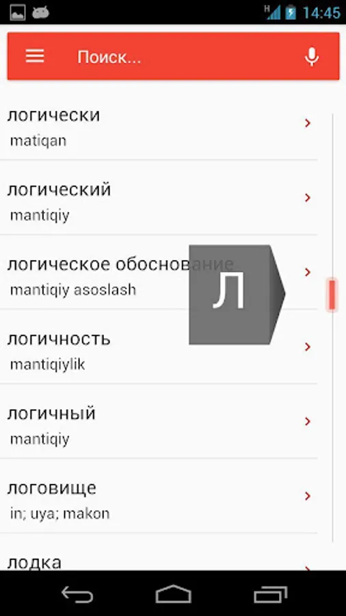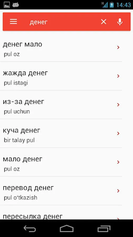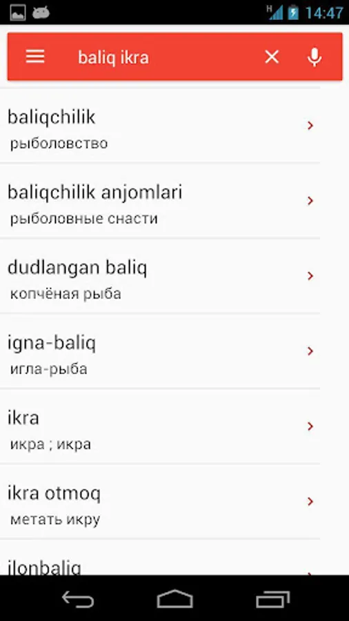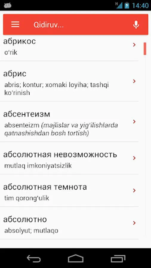 This Russian-Uzbek and Uzbek-Russian dictionary is intended to help Russian or Uzbek language learners. Dictionary includes more than 30K rows and about 50K words. Dictionary could be used in offline mode.