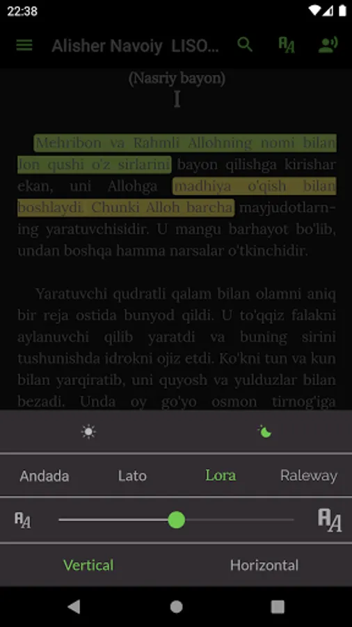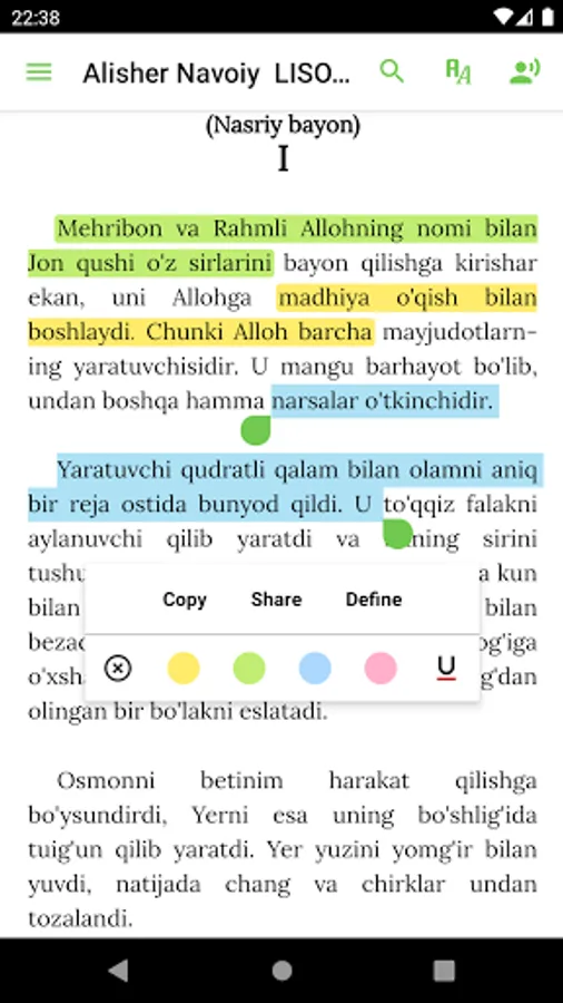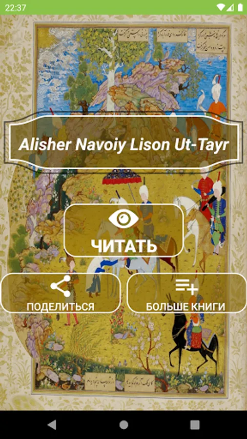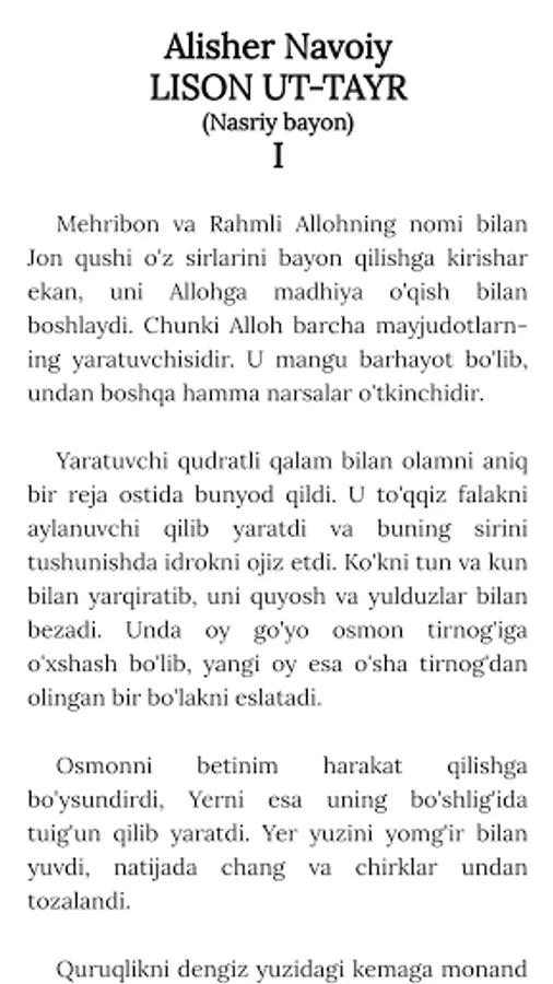 Lison ut-tayr (arab — "Qushlar tili") ushbu doston o’zbek mumtozlaridan biri hisoblanadi. O’zbek adabiy tilining muxim yodgorliklaridan bo’lgan ushbu kitob falsafiy doston bo’lib shoir unda mojizaviy obrazlar qaxromonlarning sarguzashtlari orqali tasavur qilib bo’ladigan g’oyalarni ifodalagan. Ushbu doston o’zbek adabiyotining oltinga teng kitoblaridan biri hisoblanadi Lison ut-tayr kitobi savol javob kichik hajimdagi hikoya va massalalardan tashkil topgan asardagi hikoyalardan biri Navoiyning buyuk hikoyasi aloxida ko’zga tashlanadi.