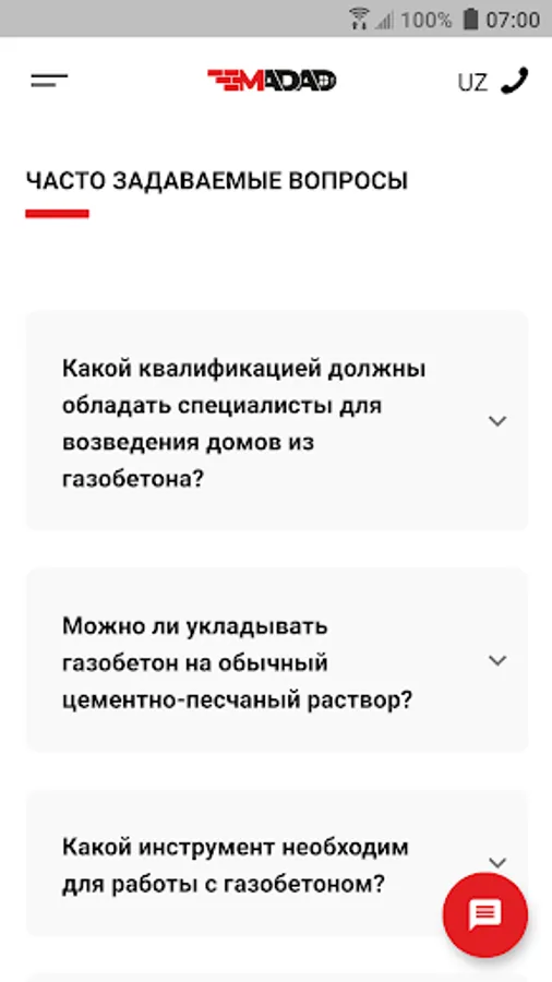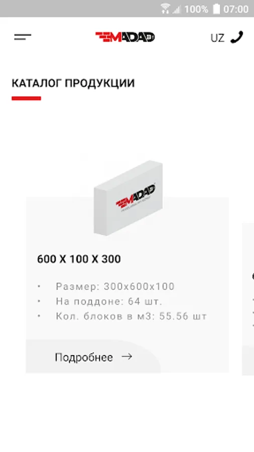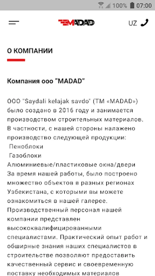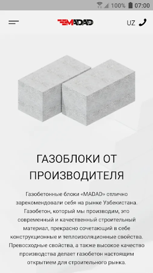 Mobile application of MADAD company. Here you can find information about the company, news, our products and get current contacts. Moreover, you can calculate the estimate of your construction site from gas blocks right in the application! Download and stay with MADAD.