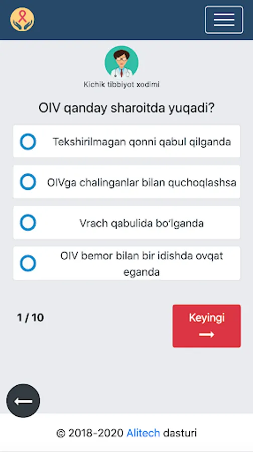 Jizzax shahar OITS markazi tomonidan yaratilgan OITS haqidagi bilimlarini tekshirish uchun shifokorlar va aholi uchun test ilovasi.