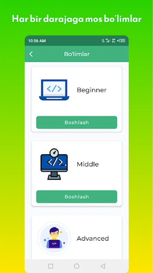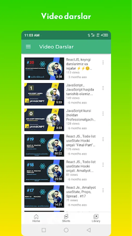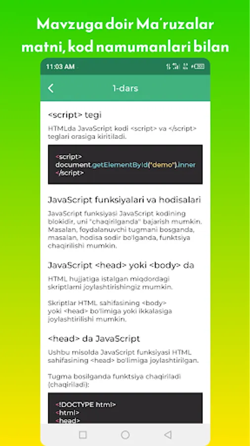 Bu ilova orqali siz uchun JavaScript dasturlash tiliga oid boshlang’ich ma’lumotlarni va web dasturchi Muhriddin Hodiev tomonidan tayyorlangan video darslarni taqdim qildik. O’ylaymizki, ilova siz uchun foydali bo’ladi va dasturlash sohasiga kirishingizda ilk qadam yoki bilimingizni mustahkamlovchi bo’lib xizmat qiladi. Agar shunday bo’lsa biz bundan mamnunmiz!