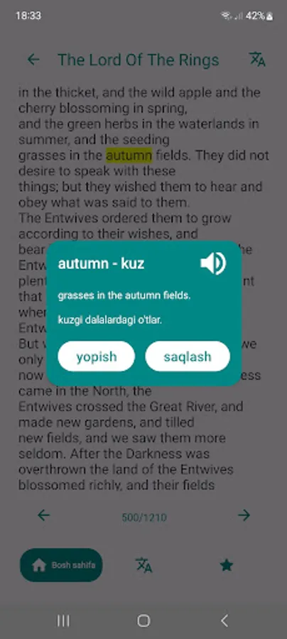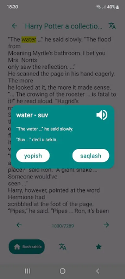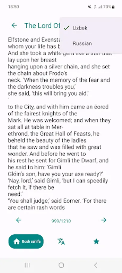 Biroq, REB ning asosiy xususiyati o'rnatilgan tarjimondir. Agar o'qish paytida siz notanish so'z yoki iboraga duch kelsangiz, uni shunchaki ajratib ko'rsatishingiz va darhol rus tiliga tarjimasini olishingiz mumkin. Bu lug'atga murojaat qilmasdan yoki boshqa ilovalarga o'tmasdan kitob mazmunini tushunishni yaxshilashga yordam beradi.