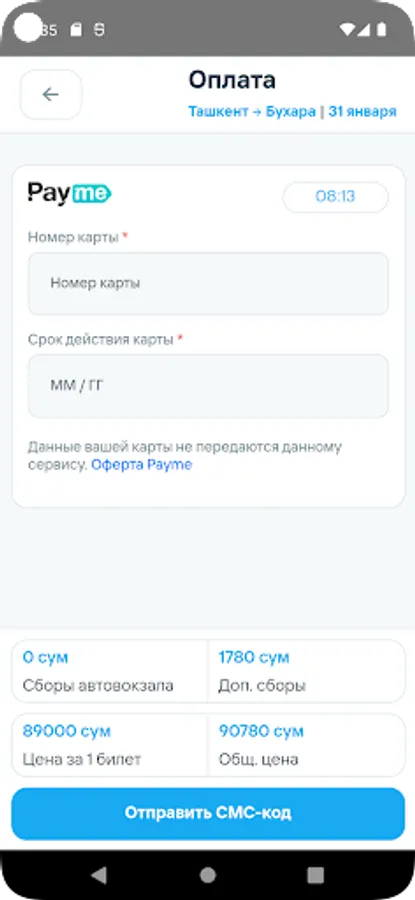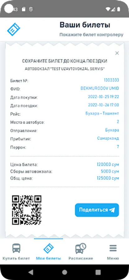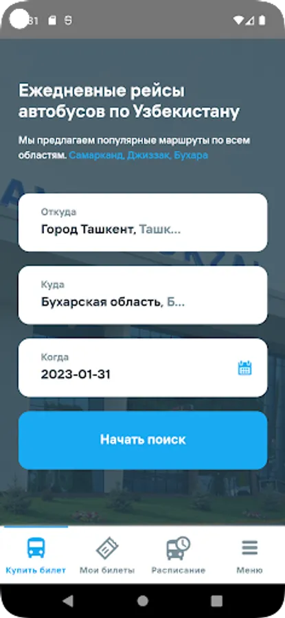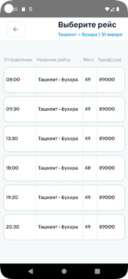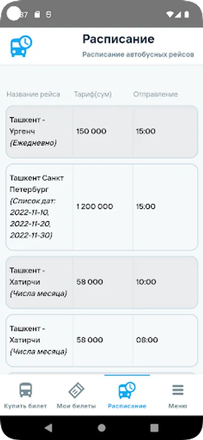 Buying online tickets from the Tashkent bus station for intercity bus flights in Uzbekistan.