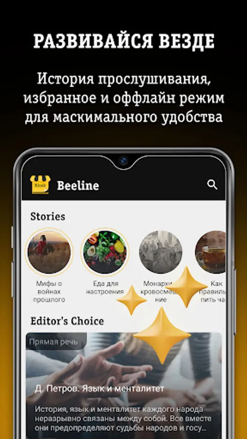 Beeline Kiosk is an opportunity to plunge into the world of self-development and change your habits. No more doom-scrolling* and no more wasting time. The intelligent system will select topics just for you. Content filtering based on your interests.