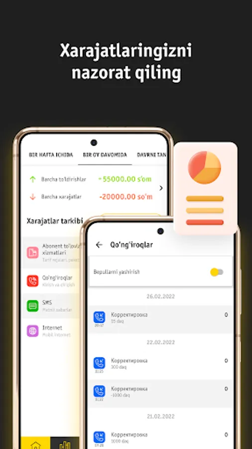 Ilovaning o'zida detalizatsiya ma'lumotlarni ko'rish va xarajatlar haqida detalizatsiya ma'lumotlarni elektron pochta orqali olish;