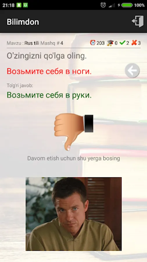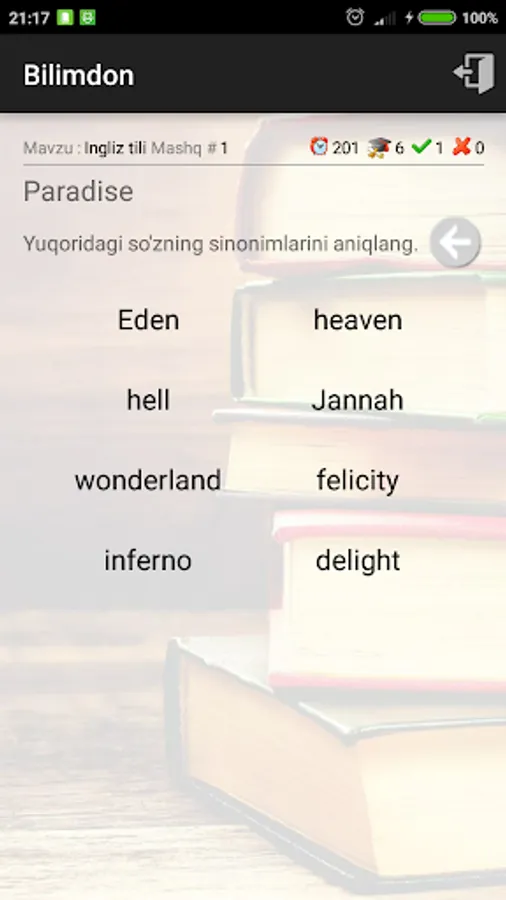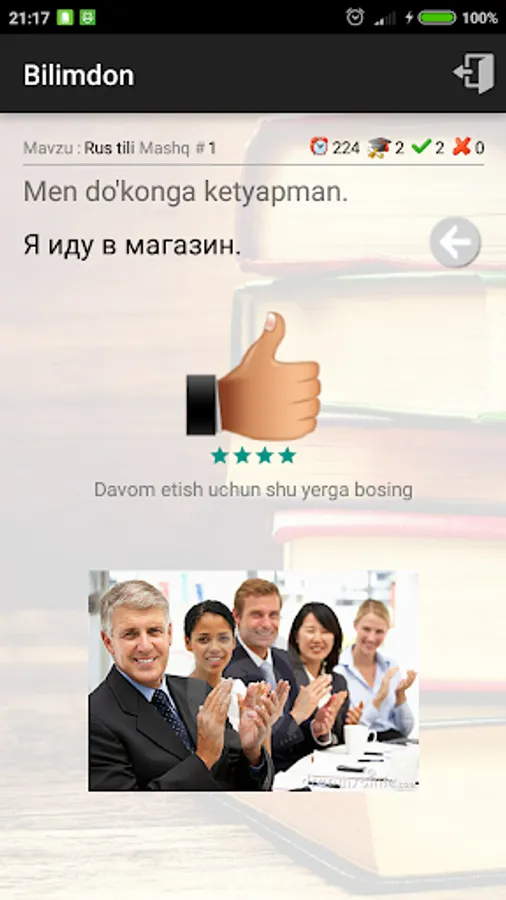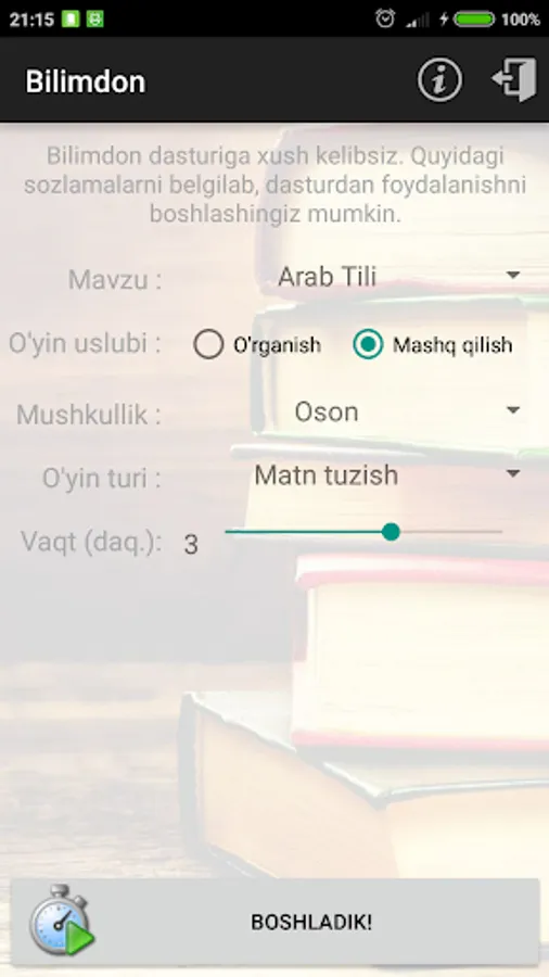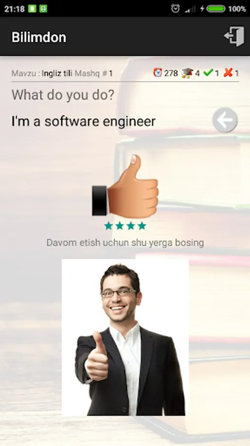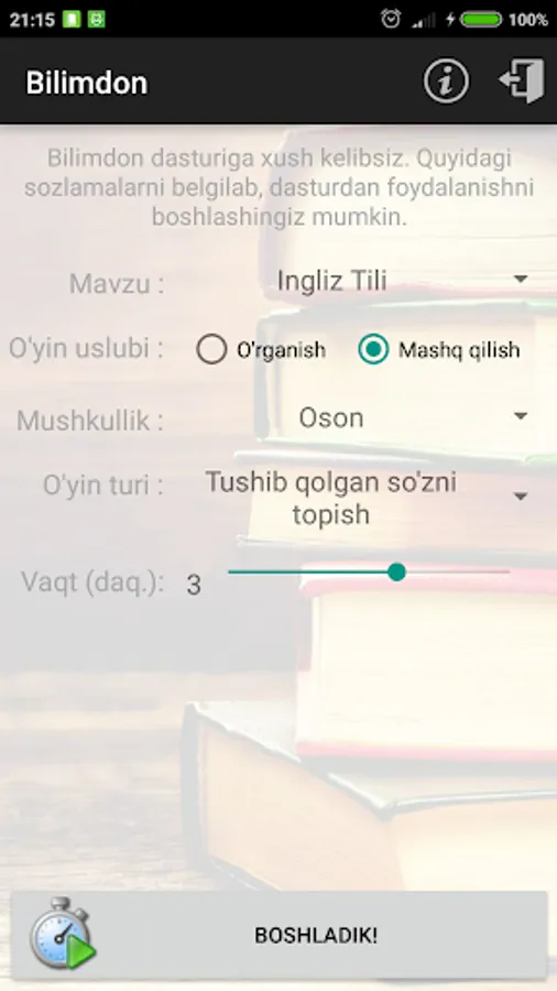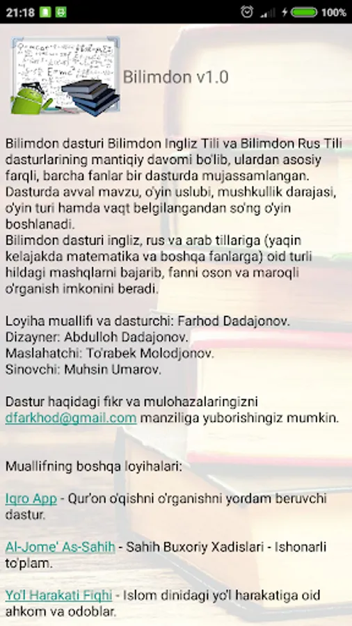 Bilimdon dasturi ingliz, rus va arab tillariga (yaqin kelajakda matematika va boshqa fanlarga) oid turli hildagi mashqlarni bajarib, fanni oson va maroqli o'rganish imkonini beradi.