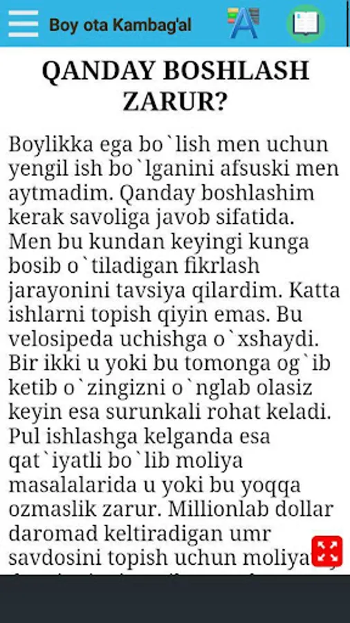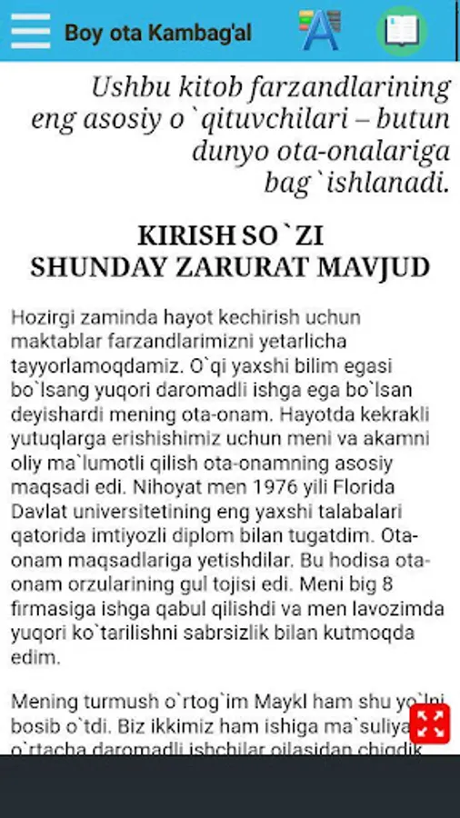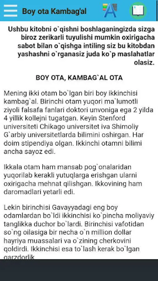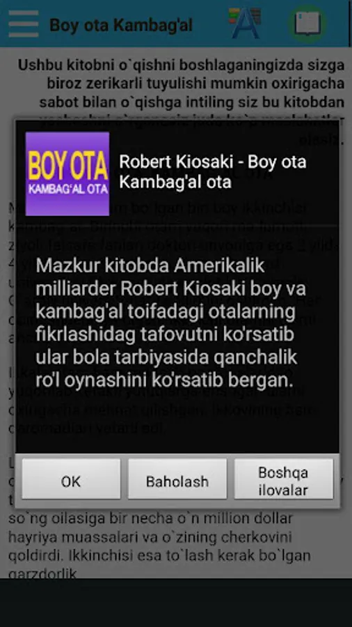 Robert Kiyosakining «Boy Ota, Kambag’al Ota» yoki "Boy dada Kambag'al dada" kitobi muvaffaqiyatli va boy bo’lishni istagan har bir kishi uchun eng yaxshi manba hisoblanadi. O’zingiz va orzularingiz uchun qanday pul ishlashni o’rgatadigan oddiy haqiqatlarni mana shu kitobdan topashingiz mumkin. O’qing, fikrlang va muvaffaqiyatli bo’ling!