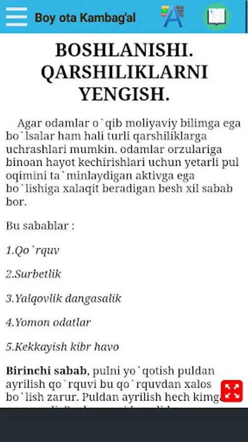 - Pul - kuch timsollaridan biri. Biroq, moliyaviy ta’lim yanada kuchlisidir. Pul keladi va ketadi, lekin ular qanday ishlayotganini bilsang, ularni boshqara olasan va boyroq bo’lishing mumkin.