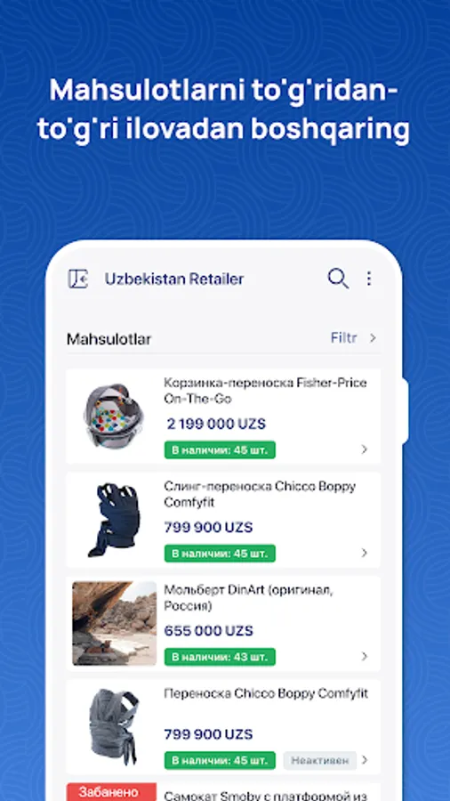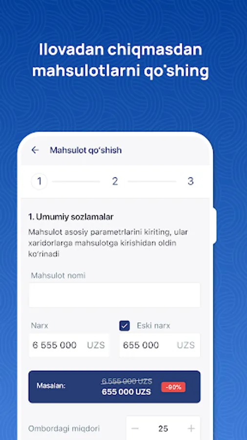 📲 Ilovaning barcha funksiyalari savdoyingizni soddalashtirishga, sizga va xaridorga qulay bo'lishiga qaratilgan. Ko'p eshitgandan ko'ra bir marta ilovadan foydalanib ko'ring va onlayn savdoyingiz rivojlanib ketganidan zavqlaning!😍