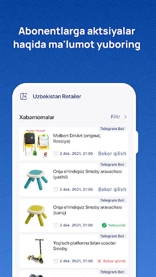 Endi savdo qilish uchun do'koningiz bilan chegaralanib qolmaysiz! Savdo esa haqiqiy maroqli amal ekanligini, Telemag ilovasi doimiy dastyoringizga aylanganligini xis qilasiz.