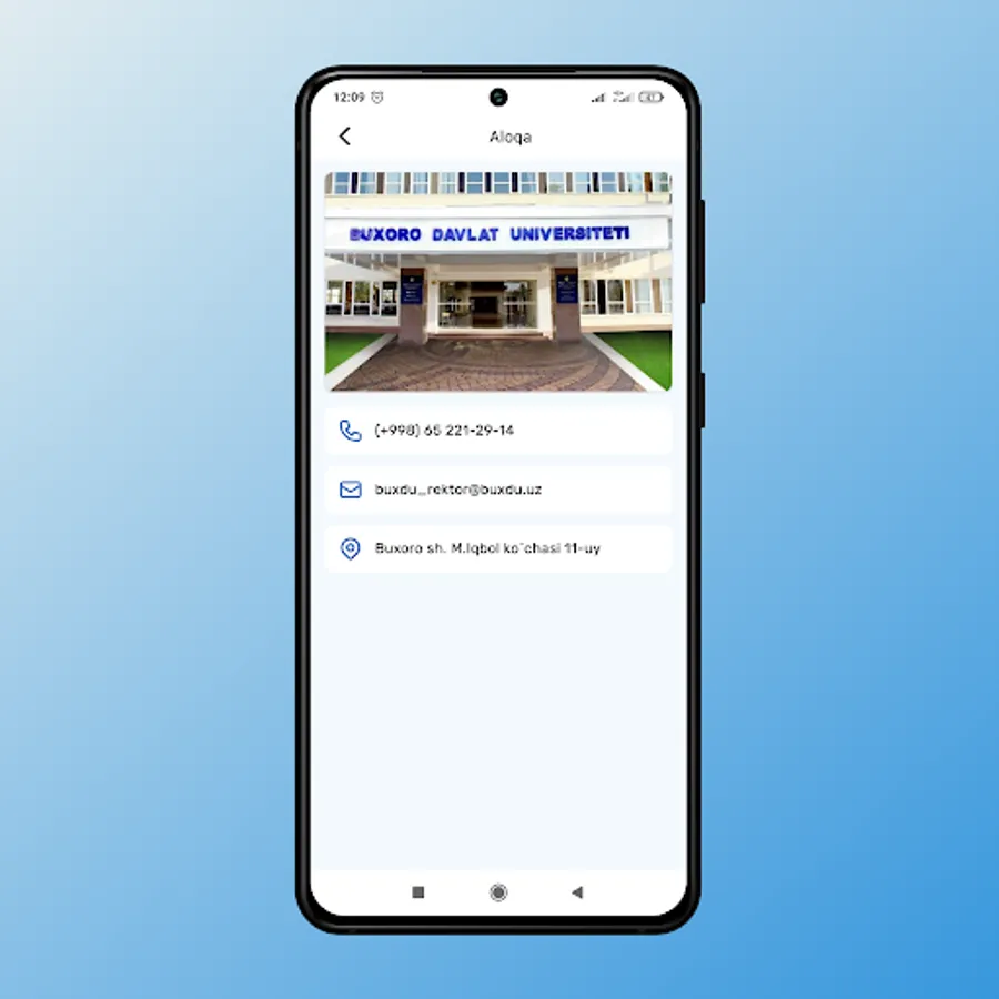- BuxDU ma'muriyatining aloqa bo'limi ma'lumotlarini olish va ko'plab qulayliklardan foydalanish imkoniyatiga egasiz.