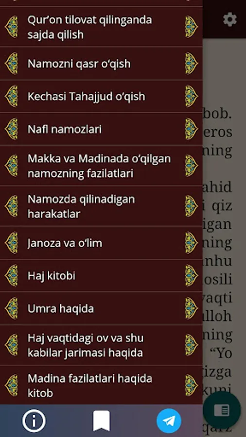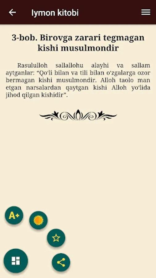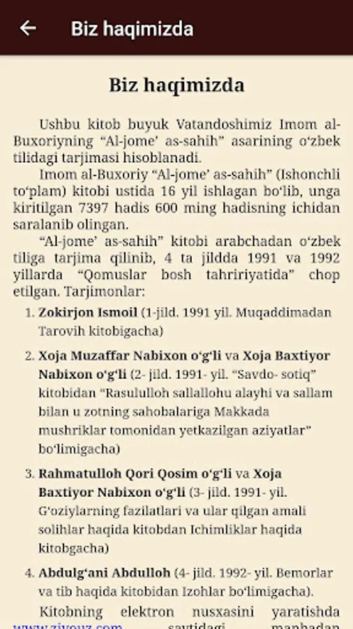 Ushbu kitob buyuk Vatandoshimiz Imom al-Buxoriyning “Al-jome’ as-sahih” asarining o‘zbek tilidagi tarjimasi hisoblanadi.