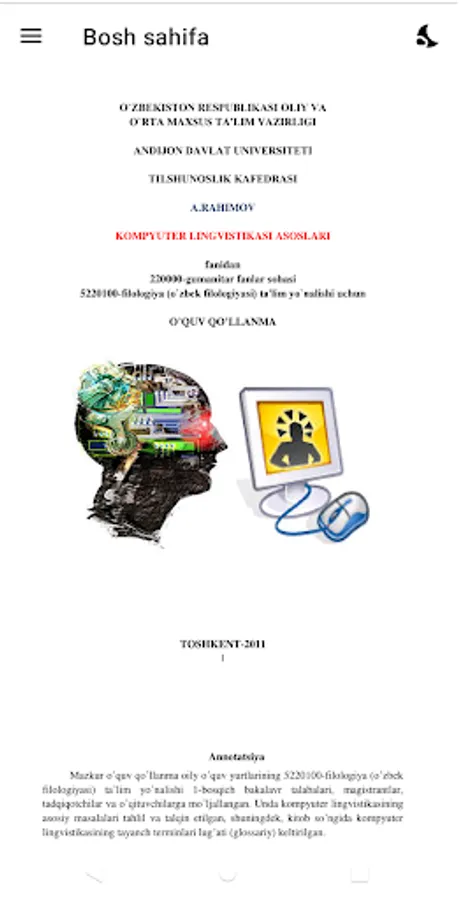 tadqiqotchilar va o’qituvchilarga mo’ljallangan. Unda kompyuter lingvistikasining asosiy masalalari tahlil va talqin etilgan, shuningdek, kitob so’ngida kompyuter lingvistikasining tayanch terminlari lug’ati (glossariy) keltirilgan.