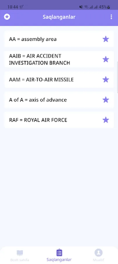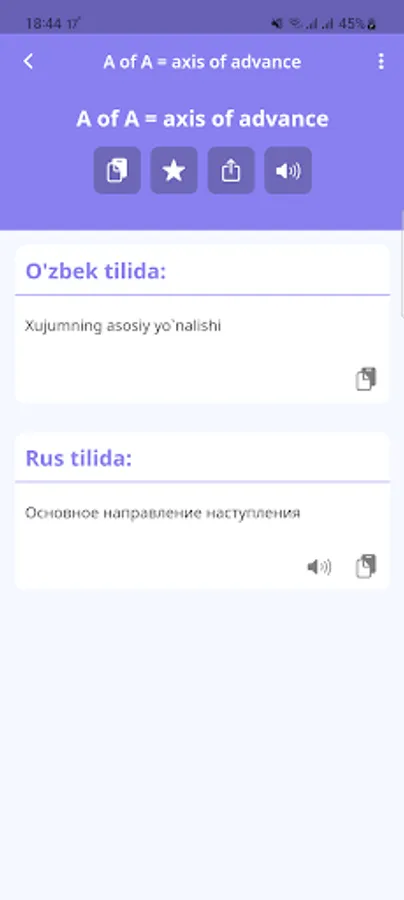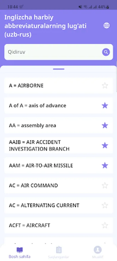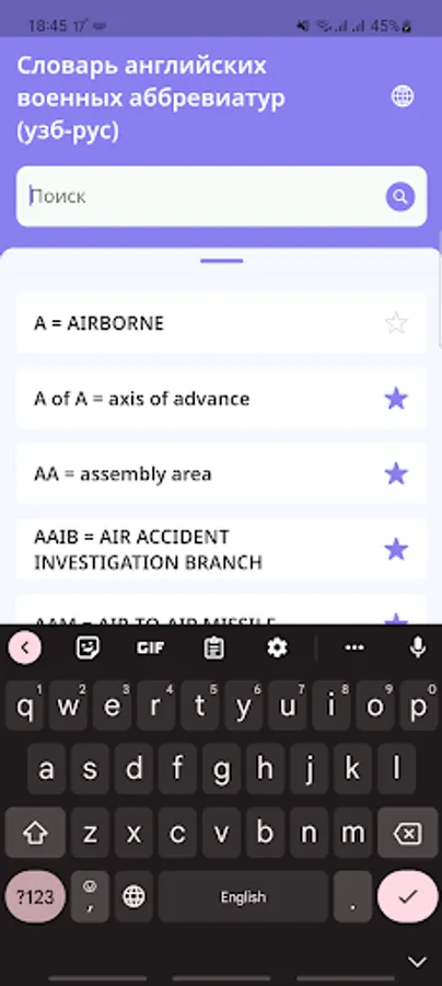 This new dictionary of military abbreviations is more than just a dictionary. You can search for English military abbreviations and find their transcripts, as well as translations of these abbreviations into Uzbek and Russian. The dictionary works offline! The dictionary also has additional features, such as bookmarks. You can copy the required abbreviation, its transcript or translation, and you can also share the translation. It contains about 400 English military abbreviations and their decoding into Uzbek and Russian, which makes it unique. It is suitable for any type of troops. The most commonly used abbreviations for aviation, navy and infantry were selected in the dictionary.