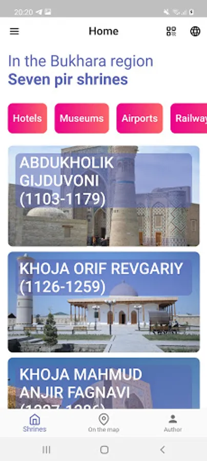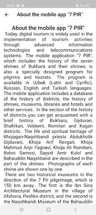 The mobile application "7 PIR" which includes the history of the seven shrines of Bukhara and their shrines, is also a specially designed program for pilgrims and tourists.