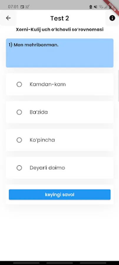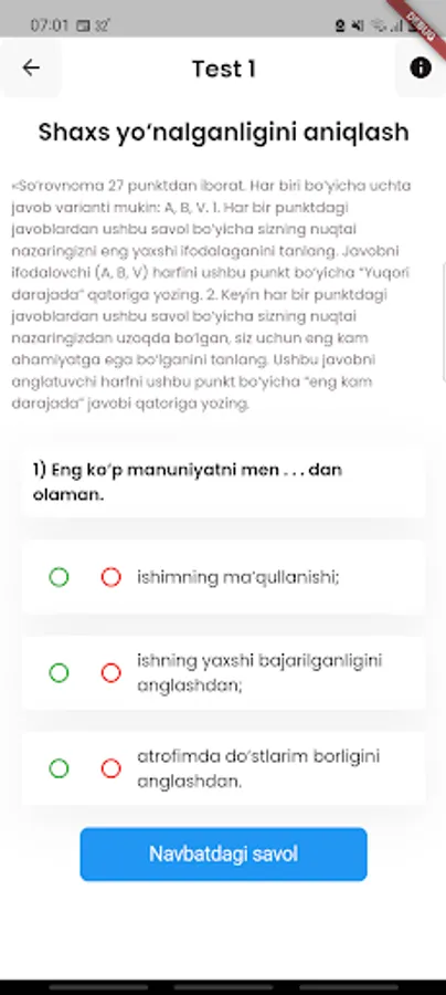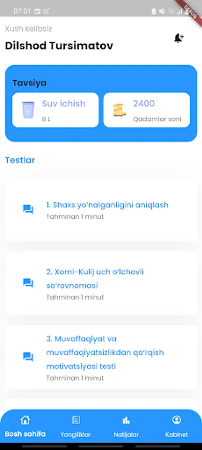 Sportchilarning psixologik holatini baholash va nazorat qilish mobil ilovasi o'z ichiga 12 xil psixologik testlar shaklini o'z ichiga olib sportchi o'zining psixologik holatlari haqida ma'lumot olishi mumkin bo'ladi.
