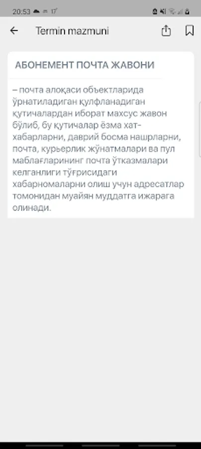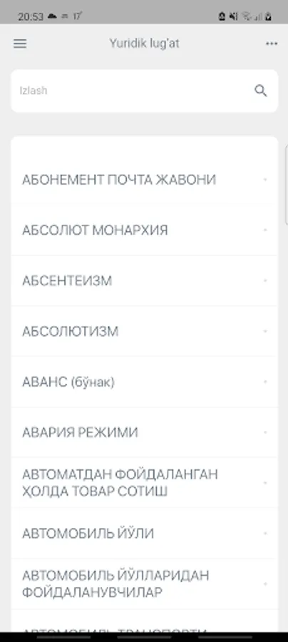 Yuridik terminlar, yuridik amaliyot, nazariya, ilm-fan va ta'lim jarayonida keng qo'llaniladigan so'zlarni o'z ichiga olgan bo'lib, O'zbekiston Respublikasi Milliy huquqiy internet portalidan olingan.