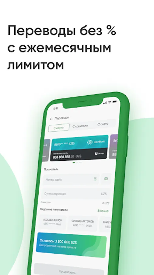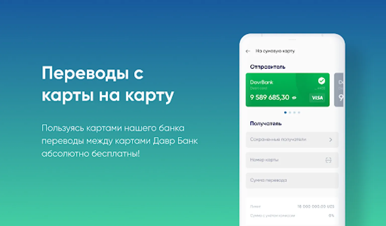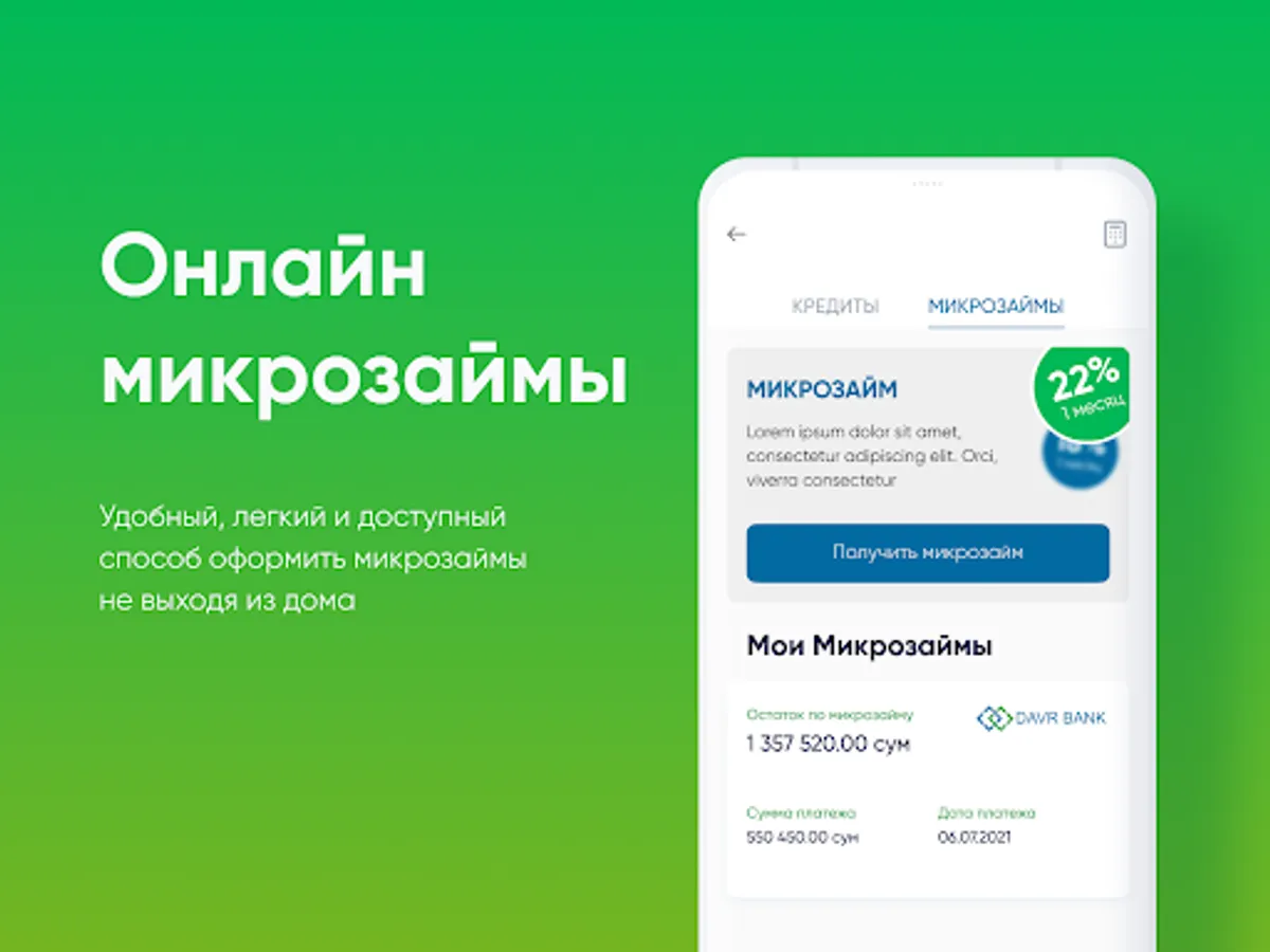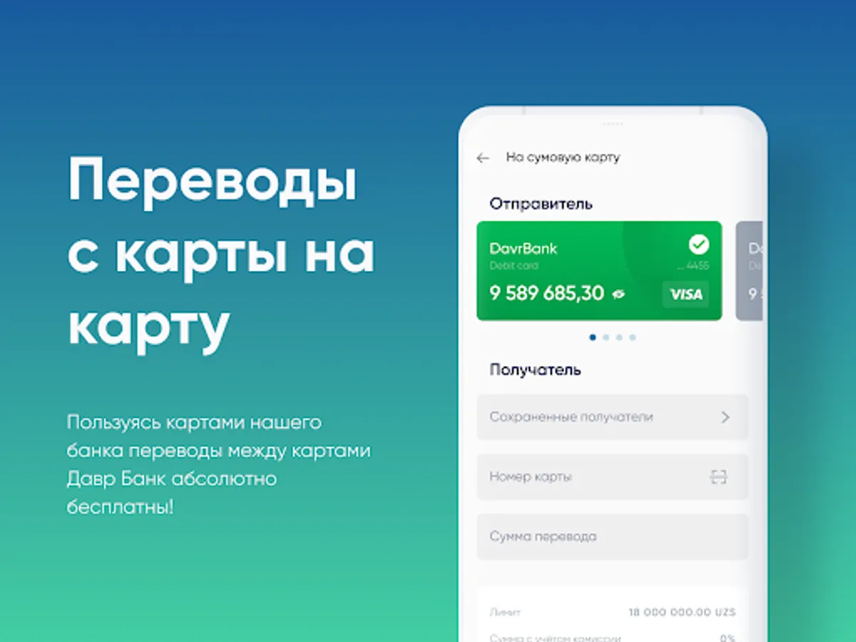 The new improved application of Davr Bank will allow you to instantly make any payments, monitor expenses, monitor cash receipts, open deposits and issue loans, transfer money from card to card and much more.