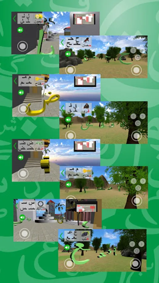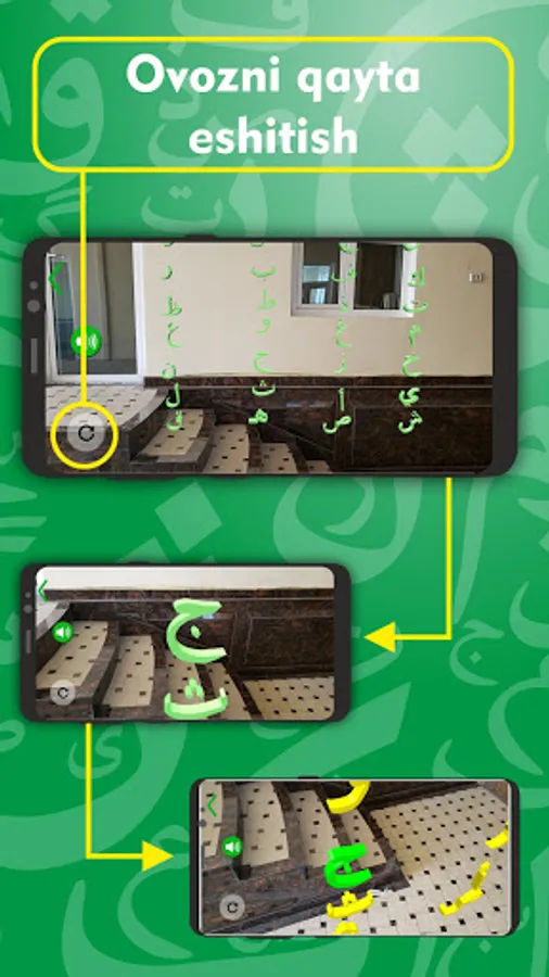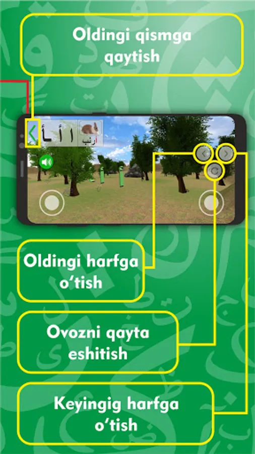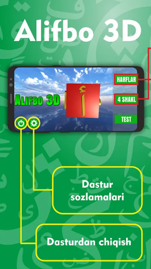 Avvalo har bir harfni o'rganib chiqiladi. Harflarni o'qilishi mavjud va ba'zi harflarni maxraji 3D audio shaklida berilgan. Keyin harflarni 4 xil shakl ko'rinishlari o'rganiladi. O'rganilgan harflarni ovozga qarab test qiladi.