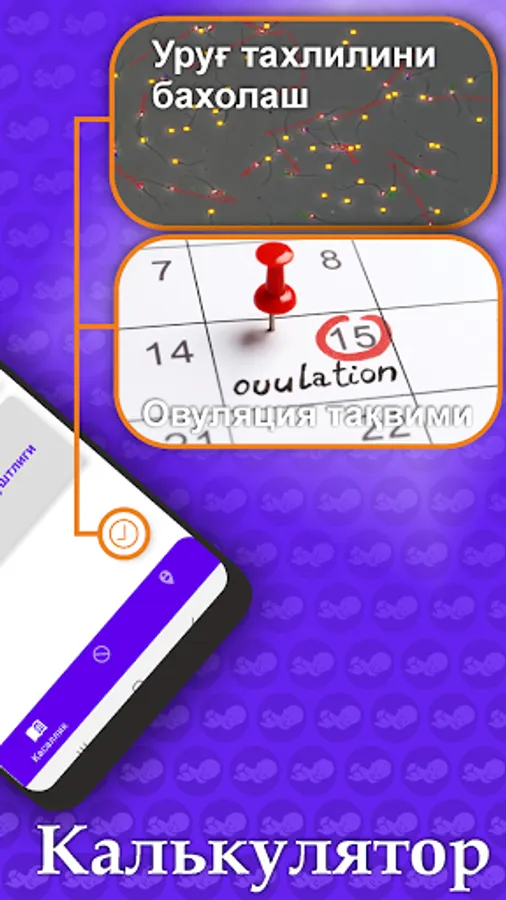 Ayollar ovulation (tukhum etilib chiқishi) vatini aniқlab beradigan calculator. Bu қismga oi kўrish boshlangan kun va menstruation vatini kiritilsa, tukhum etilish kuni, farzand blish kunlari va agar shu oyda farzand bulsa, uning meyeriy tuғilish kunlarini hisoblab beradi.