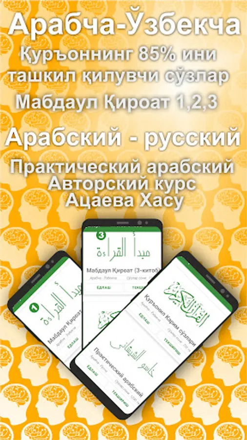 Arab tilida Mabdaul Qiroat kitobini 1,2,3 Qismlari, Dr. Abdulaziz Abdukarimning "Qur'on sozlarini 85% and" Kitobi wa Chechenistonlik Hasuning "Practical Arabic" dasturi sozlari majud. Zhami 5360 ta sўz bor.
