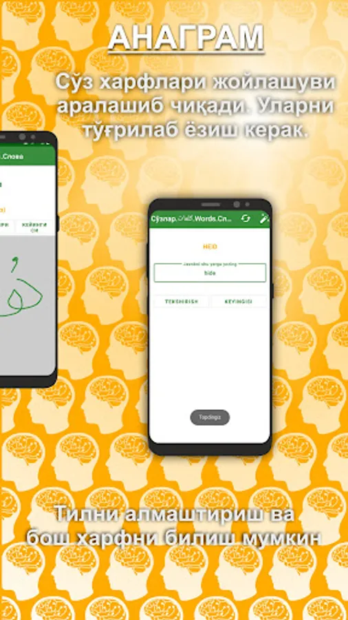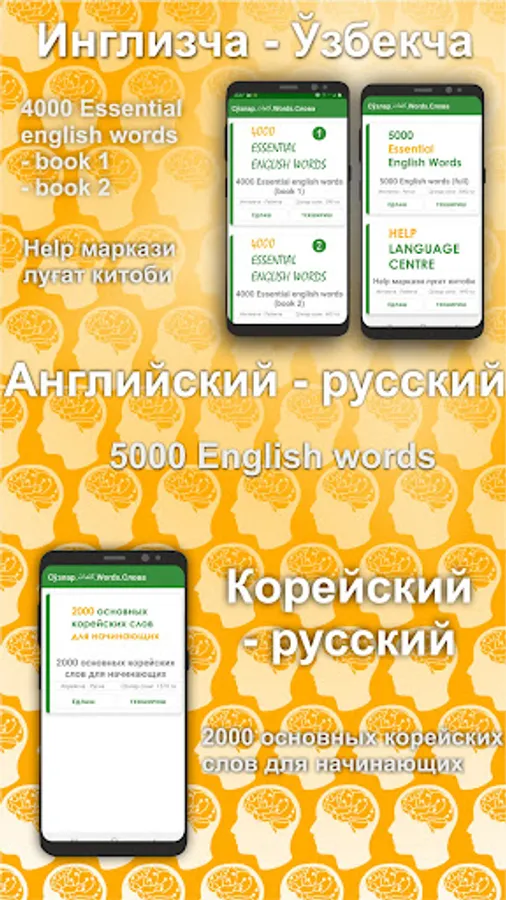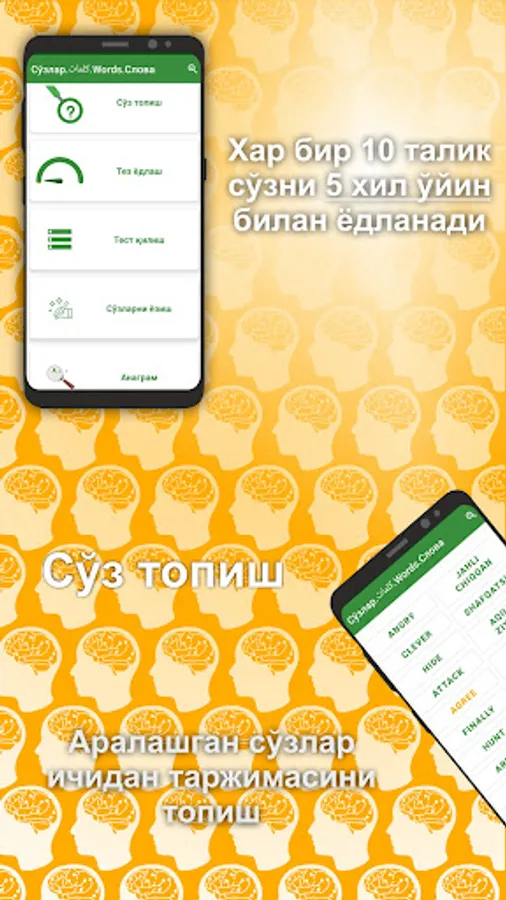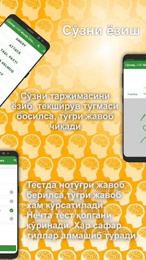 Dastur khar bir kitob sozlarini 10 tadan qilib yodlatadi. Shu 10 ta sўzni 5 khil usulda Ainab yodlash imkonini beradi.