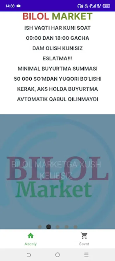 "BILOL MARKET" dasturi siz azizlar uchun qulaylik yaratish maqsadida ham vaqtingizni ham pulingizni tejash maqsadida o'z faoliyat turini ochdi. Siz "BILOL MARKET" orqali o'zingizni turmush tarzingizda - ro'zg'oringizda ishlatadigan barcha turdagi mahsulotlarni topsangiz bo'ladi. Nafaqat topishingiz hamda buyurtma berishingiz mumkin. Buyurtmani uyingizgacha yetkazib berishadi. BUXORO SHAHAR bo'ylab.
