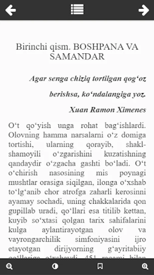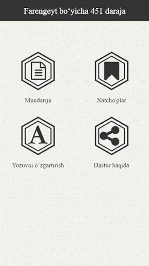 Roman Yer yuzida hayotni saqlab qolish, inson uchun xavotirlanish va unga chuqur ishonch ruhi bilan sugʻorilgan. R. Bredberi ijodida katta oʻrin tutgan “Farengeyt boʻyicha 451 daraja” romanini olim va jurnalist Mirza Anvar Karimov tarjimasi sizlarga ulashmoqdamiz.
