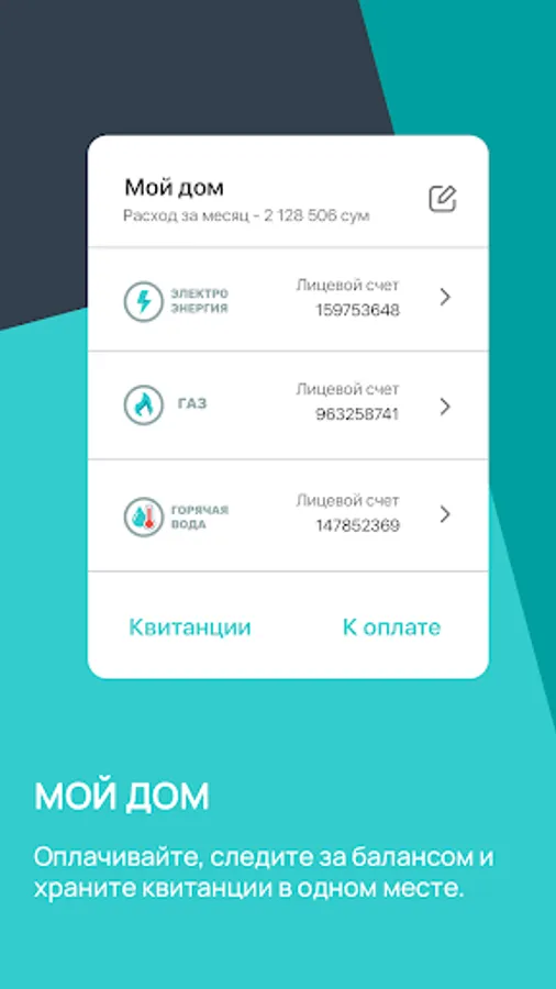 Kommunal xizmatlarga to’lash. Kommunal xizmatlarga to’lash yanada osonlashdi. Vaqtingizni qadrlang va ilova orqali kommunal xizmatlarga to’lang. Barcha cheklar saqlanib boriladi va ularni printerda chop etish mumkin.