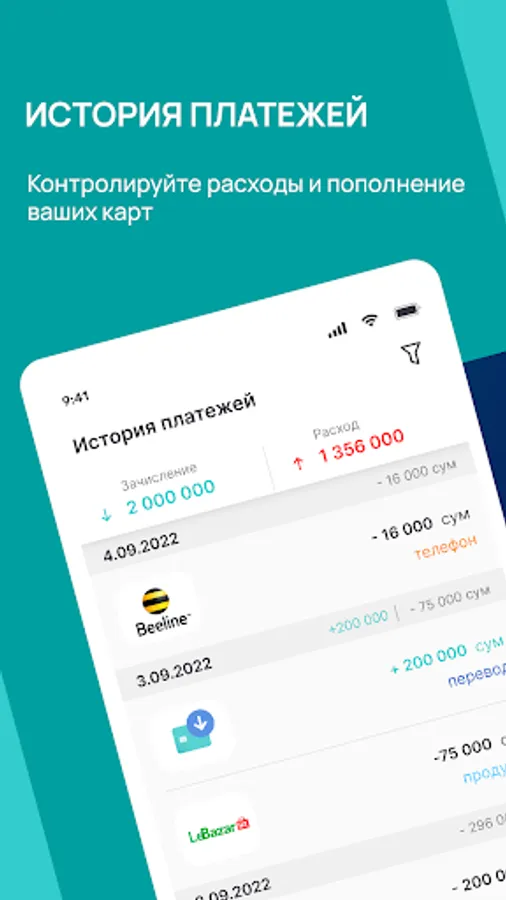 Xarajatlarni boshqarish. Barcha kartalaringizdagi qoldiqlarni nazorat qiling, kirim-chiqimlar statistikasini san ava kategoriyalar bo’yi ko’rib boring.