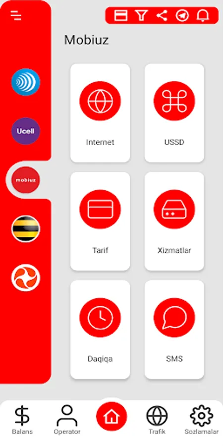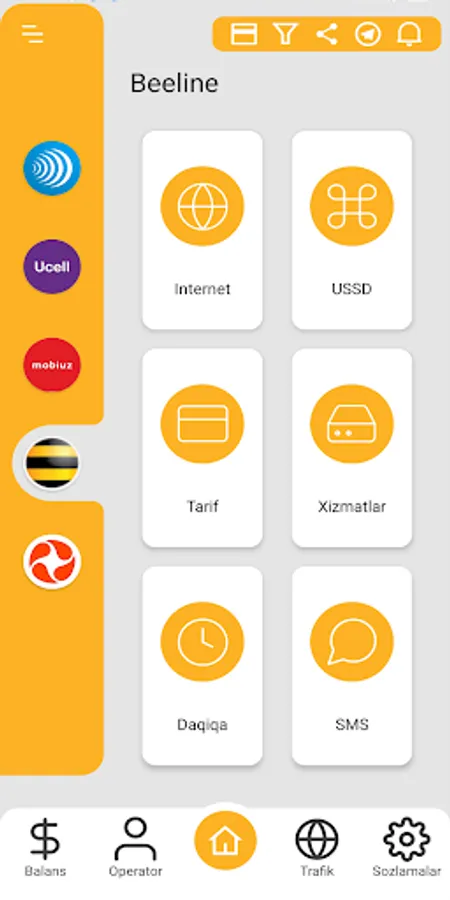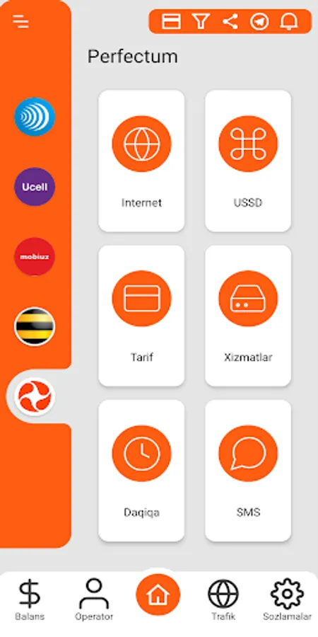 Dasturni o'rnatganingizdan so'ng O'zbekiston mobil aloqa operatorlari Mobiuz UMS Uzmobile Ucell Beeline va Perfectum haqida barcha savollaringizga javoblar olasiz va quyidagi imkoniyatlarga ega bo'lasiz: