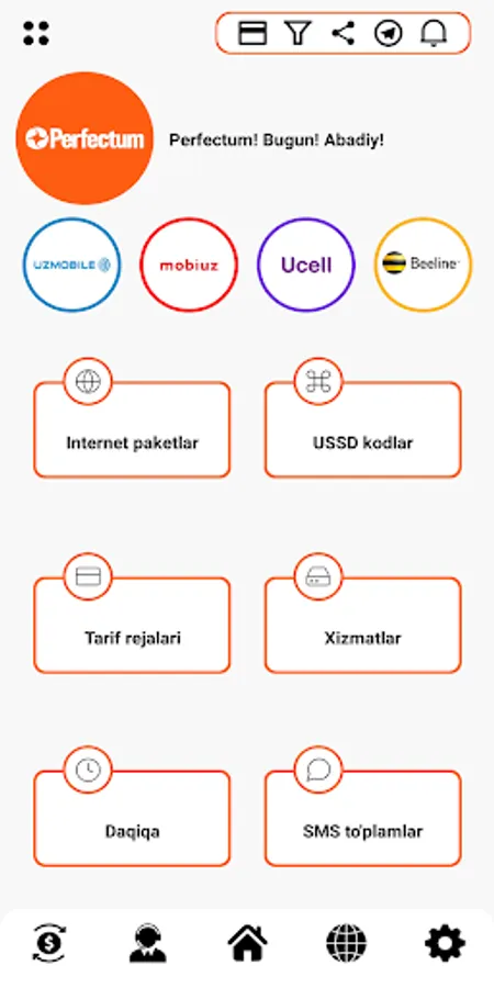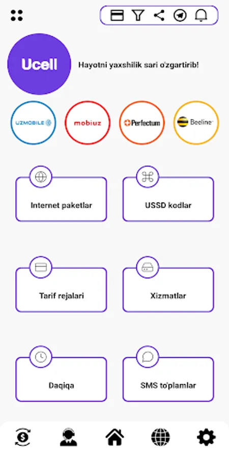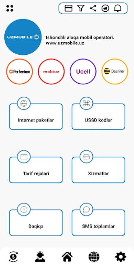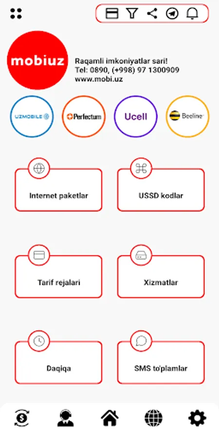 By installing the application you will receive answers to all questions and the following opportunities from mobile operators of Uzbekistan - UMS - UMS, Uzmobile - Uzmobayl, Ucell - Usel, Beeline Beeline and Perfectum - Perfect: