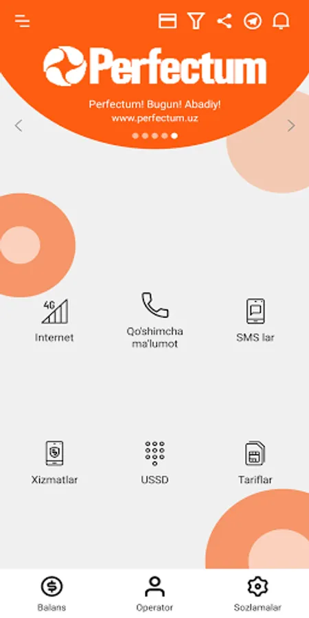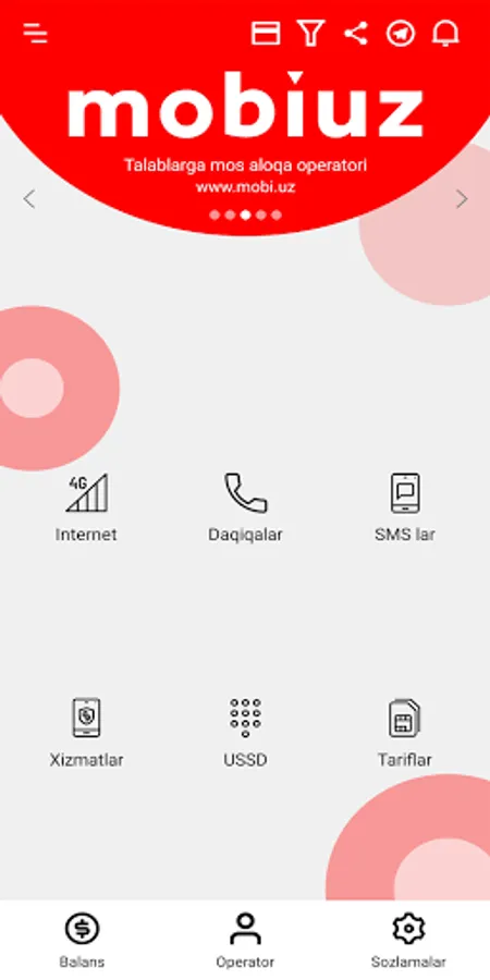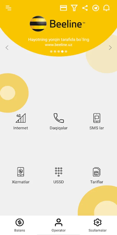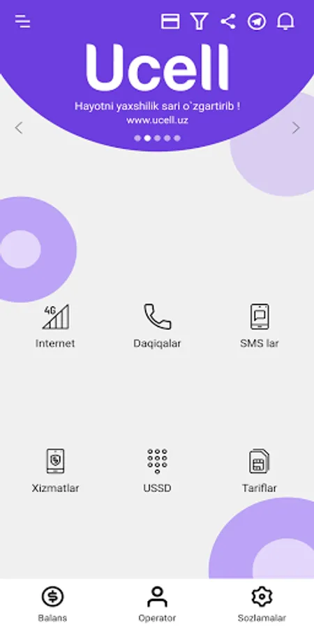 By installing the application, you will receive answers to all questions and the following opportunities from the cellular operators of Uzbekistan - UMS (UMS), Uzmobile (Uzmobile), Yusel (Ucell), Beeline (Beeline) and Perfectum (Perfectum):