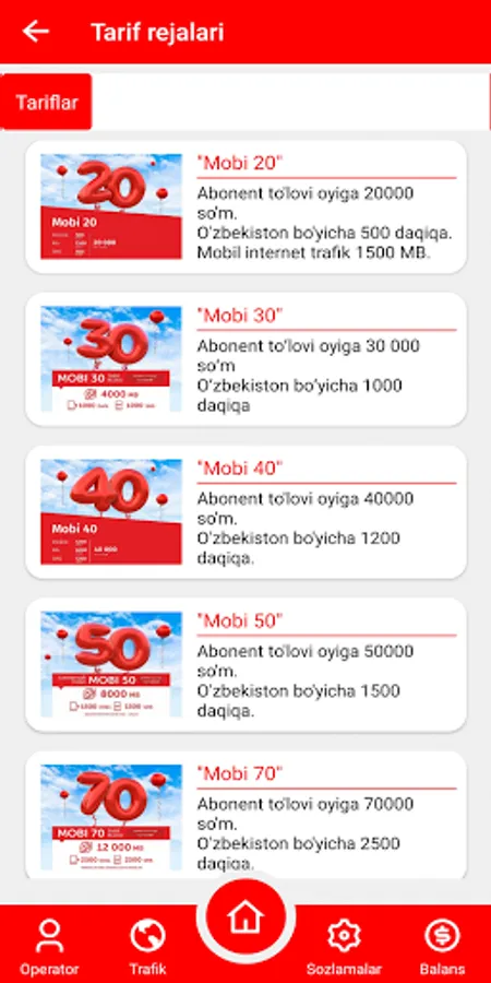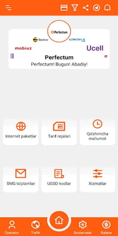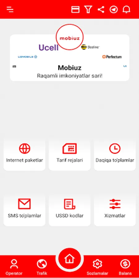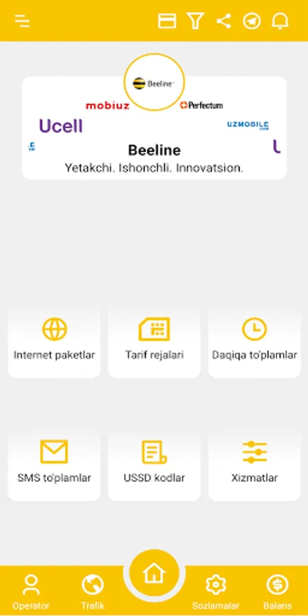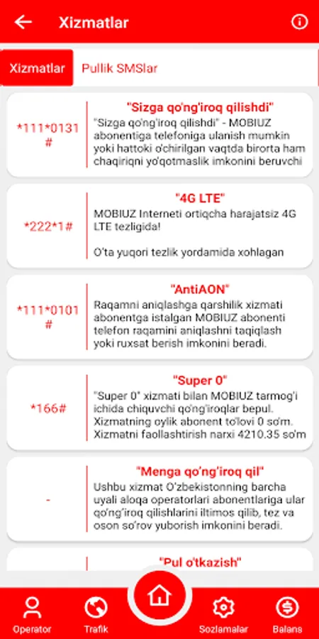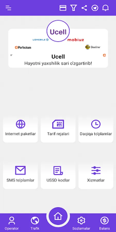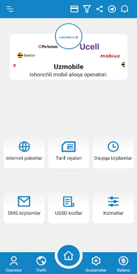 By installing the application, you will receive answers to all questions and the following opportunities from the mobile operators of Uzbekistan - UMS (UMS), Uzmobile (Uzmobile), Yusel (Ucell), Beeline (Beeline) and Perfectum (Perfectum):