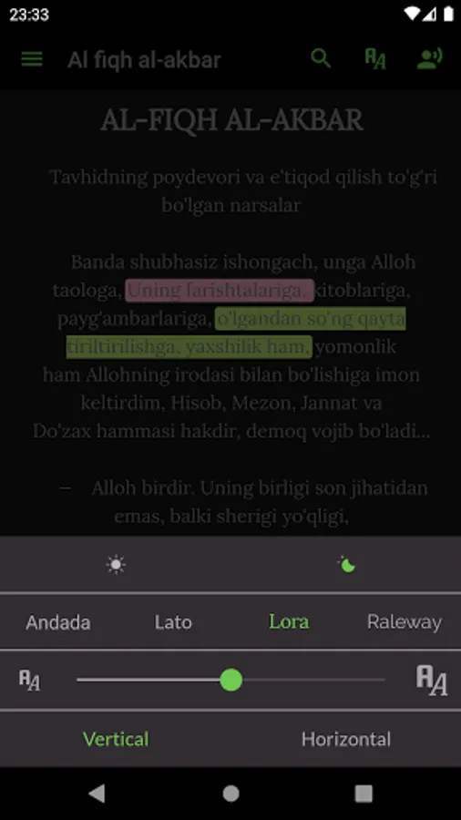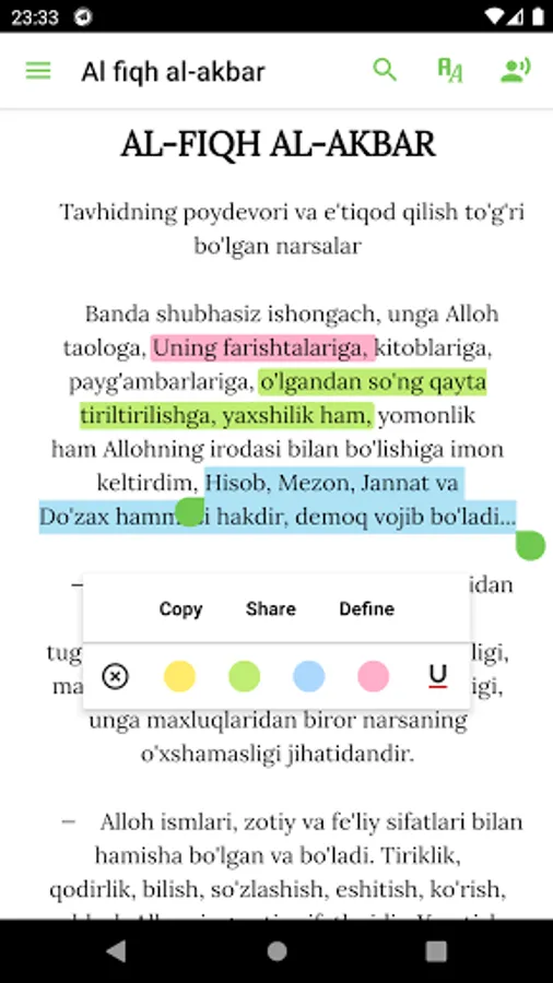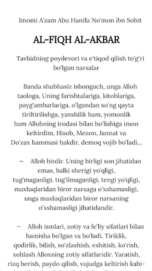 “Al-Fiqh al-akbar” (“Katta fiqh”) asari ahli sunnat va jamoat ta'limotining moturidiya yo'nalishining yuzaga kelishiga asos bo'lgan. “Al-Fiqh al-akbar” ga bir necha marta sharhlar bitilgan, arabcha matni toshbosmalarda nashr qilingan. U o'zbek tilida ham bir necha marta e'lon etilgan, arabcha matni O'zbekistonda ham chop qilingan. Imomi A'zam Abu Hanifa rahimahullohning barcha asarlari o'zbek tiliga tarjima qilingan.Alloh taoloni o'z kitobida jami sifatlari bilan o'zini vasf qilganidek haqiqiy ma'rifat ila taniymiz. Hech kim Alloh taologa unga loyiq bo'lganidek haqiqiy ibodat qilishga qodir bo'la olmaydi. Lekin, uni o'z kitobida va rasulining sunnatida buyurganidek buyrug'iga binoan ibodat qiladi.