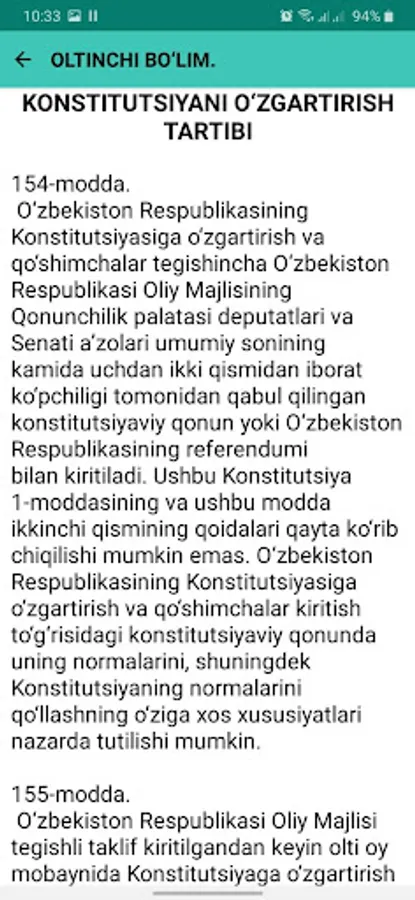 O‘zbekiston Respublikasi Konstitutsiyasi O‘n ikkinchi chaqiriq O‘zbekiston Respublikasi Oliy Kengashining o‘n birinchi sessiyasida 1992 yil 8 dekabrda qabul qilingan.