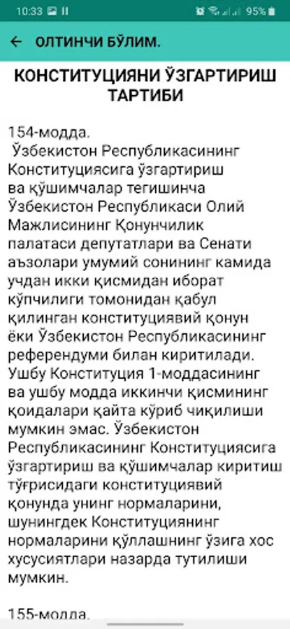 (2002 yil 27 yanvarda o‘tkazilgan umumxalq referendumi natijalariga ko‘ra hamda uning asosida O‘zbekiston Respublikasining 2003 yil 24 aprelda qabul qilingan Qonuniga muvofiq O‘zbekiston Respublikasining Konstitutsiyasi XVIII, XIX, XX, XXIII boblariga o‘zgartishlar va qo‘shimchalar kiritilgan. O‘zbekiston Respublikasining 2007 yil 11 aprelda qabul qilingan Qonuni bilan O‘zbekiston Respublikasining Konstitutsiyasi 89-modaasiga, 93- moddasining 15-bandiga, 102-moddasining ikkinchi qismiga tuza- tishlar kiritilgan. O‘zbekiston Respublikasining 2008 yil 25 dekabrda qabul qilingan Qonuni bilan O‘zbekiston Respublikasining Konstitutsiyasi 77-moddasining birinchi qismiga o‘zgartish kiritilgan. O‘zbekiston Respublikasining 2011 yil 18 aprelda qabul qilingan Qonuni bilan O‘zbekiston Respublikasining Konstitutsiyasi 78, 80, 93, 96 va 98-moddalariga o‘zgartish va qo‘shimchalar kiritilgan. O‘zbekiston Respublikasining 2011 yil 12 dekabrda qabul qilingan Qonuni bilan O‘zbekiston Respublikasining Konstitutsiyasi 90-moddasining ikkinchi qismiga tuzatish kiritilgan. O‘zbekiston Respublikasining 2014 yil 16 aprelda qabul qilingan Qonuni bilan O‘zbekiston Respublikasining Konstitutsiyasi 32, 78. 93, 98, 103 va 117-moddalariga o‘zgartish va qo‘shimchalar kiritilgan. O‘zbekiston Respublikasining 2017 yil 6 aprelda qabul qilingan Qonuni bilan O‘zbekiston Respublikasining Konstitutsiyasi 80, 81, 83, 93, 107, 110 va 111-moddalariga o‘zgartishlar va qo‘shimcha kiritilgan. O‘zbekiston Respublikasining 2017 yil 31 mayda qabul qilingan Qonuni bilan O‘zbekiston Respublikasining Konstitutsiyasi 80, 93, 108 va 109-moddalariga o‘zgartishlar kiritilgan. O‘zbekiston Respublikasining 2017 yil 29 avgustda qabul qilingan Qonuni bilan O‘zbekiston Respublikasining Konstitutsiyasi 99 va 102-moddalariga o‘zgartishlar kiritilgan.)